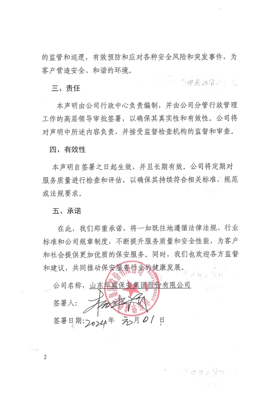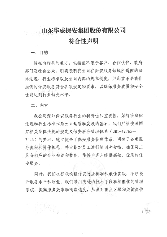 旨在向相關(guān)利益方,包括但不限于客戶、合作伙伴、政府部門及社會(huì)公眾,明確表明我公司在保安服務(wù)領(lǐng)域所遵循的法律法規(guī)、行業(yè)標(biāo)準(zhǔn)以及公司內(nèi)部的規(guī)章制度,并鄭重承諾我們提供的保安服務(wù)符合各項(xiàng)規(guī)定和要求,以確保服務(wù)質(zhì)量和安全性能達(dá)到行業(yè)領(lǐng)先水平。