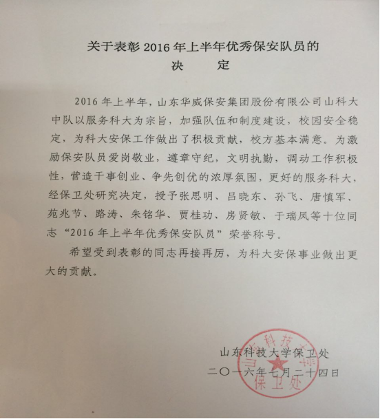 7月25日上午,山東科技大學(xué)保衛(wèi)處對(duì)2016年上半年優(yōu)秀保安隊(duì)員進(jìn)行了表彰,青島分公司山東科技大學(xué)項(xiàng)目部十名保安隊(duì)員獲得榮譽(yù)稱號(hào)。
