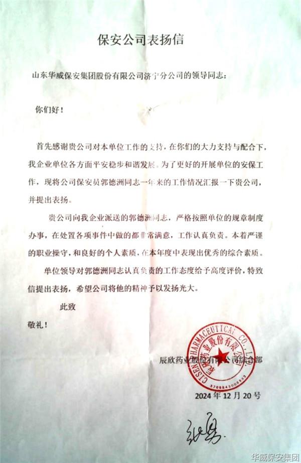 龍影漸遠(yuǎn)辭舊歲,吉蛇獻(xiàn)瑞啟新程。新春之際,華威保安濟(jì)寧分公司,先后收到了來自客戶辰欣藥業(yè)、煙草公司配送庫的兩封表揚(yáng)信,對駐勤華威保安團(tuán)隊、保安隊員郭德洲一年來在...